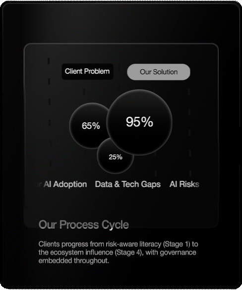Don’t let risk hold you back. We empower mid-market enterprises with the strategy, governance, and implementation support needed to turn AI hype into measurable ROI, without the Big 4 price tag.