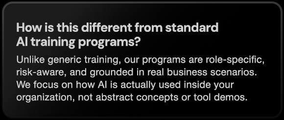 Customized AI Literacy & Training equips leaders and employees with role-specific guidance to use AI effectively, safely, and responsibly in their day-to-day work.