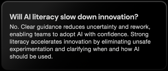 Focused AI literacy transforms AI from a perceived risk into a controlled capability. By aligning knowledge to role-specific responsibilities, organizations prevent costly mistakes, accelerate safe adoption, and establish a culture where AI is used deliberately, not experimentally. When teams know the boundaries, escalation paths, and expectations, innovation moves faster, and governance becomes operational rather than theoretical.