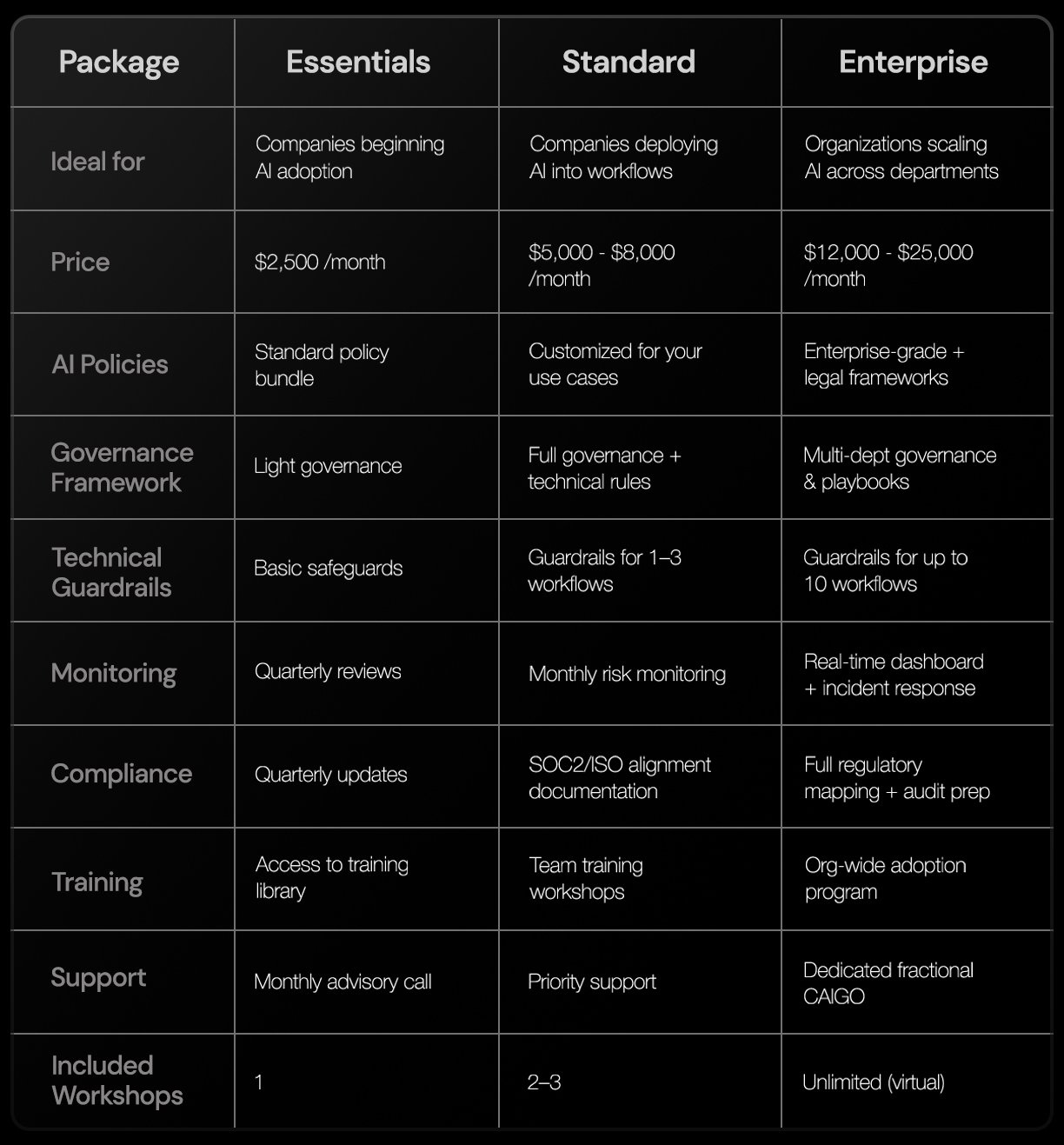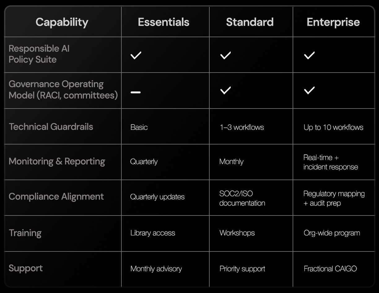 A comprehensive audit of your Al maturity, risks, compliance gaps, and biggest opportunities.